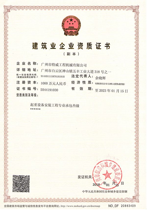 廣州市特威工程機械有限公司地處廣州市白云區神山鎮,廣清高速神山出口附近,是一家施工升降機的專業生產廠家。公司成立于2011年,占地100000多平方米,注冊資金1060萬元,現有員工300余人其中工程技術人員33人,高級技術人員52人。
